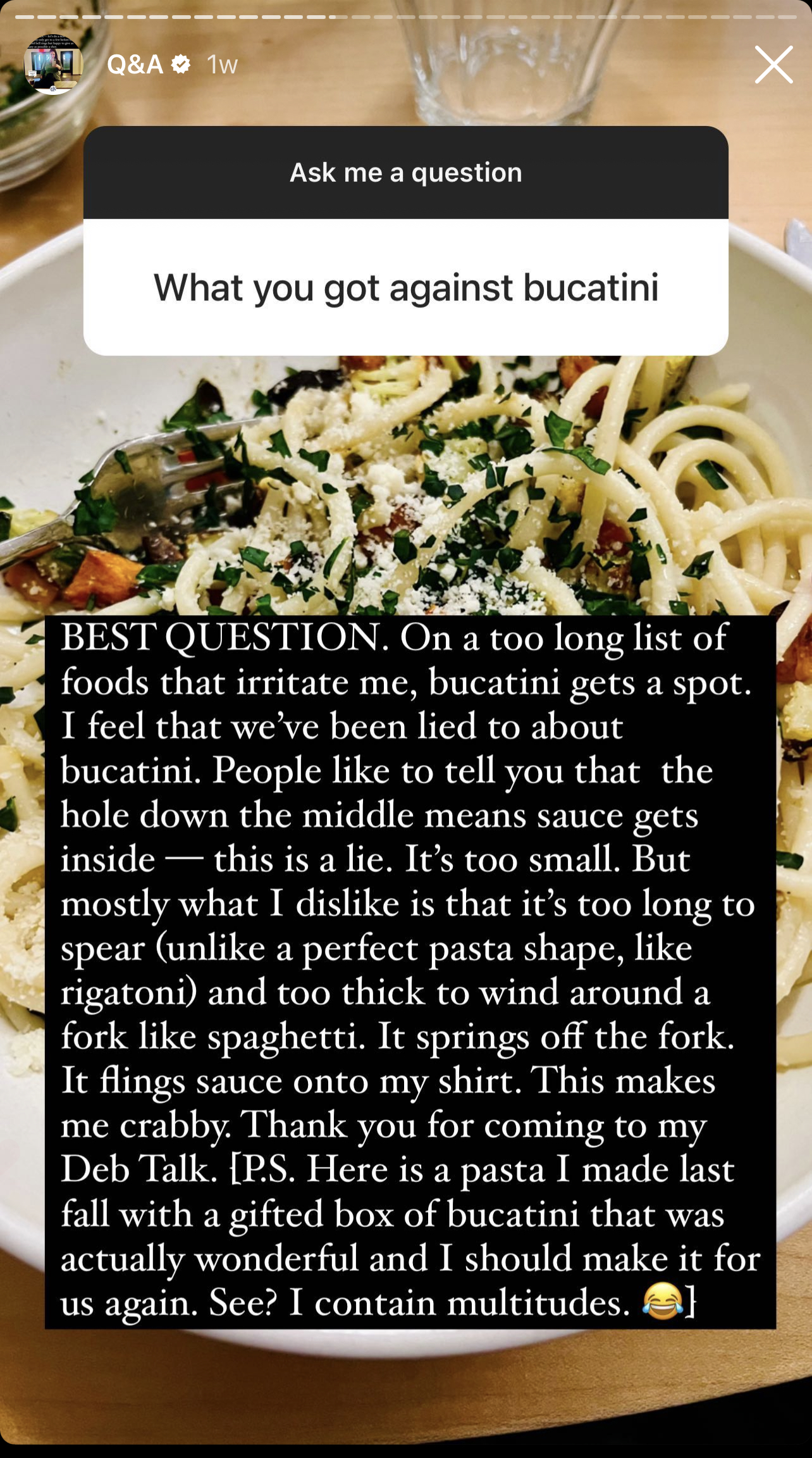 Whoa whoa whoa, Deb you don’t like bucatini?!