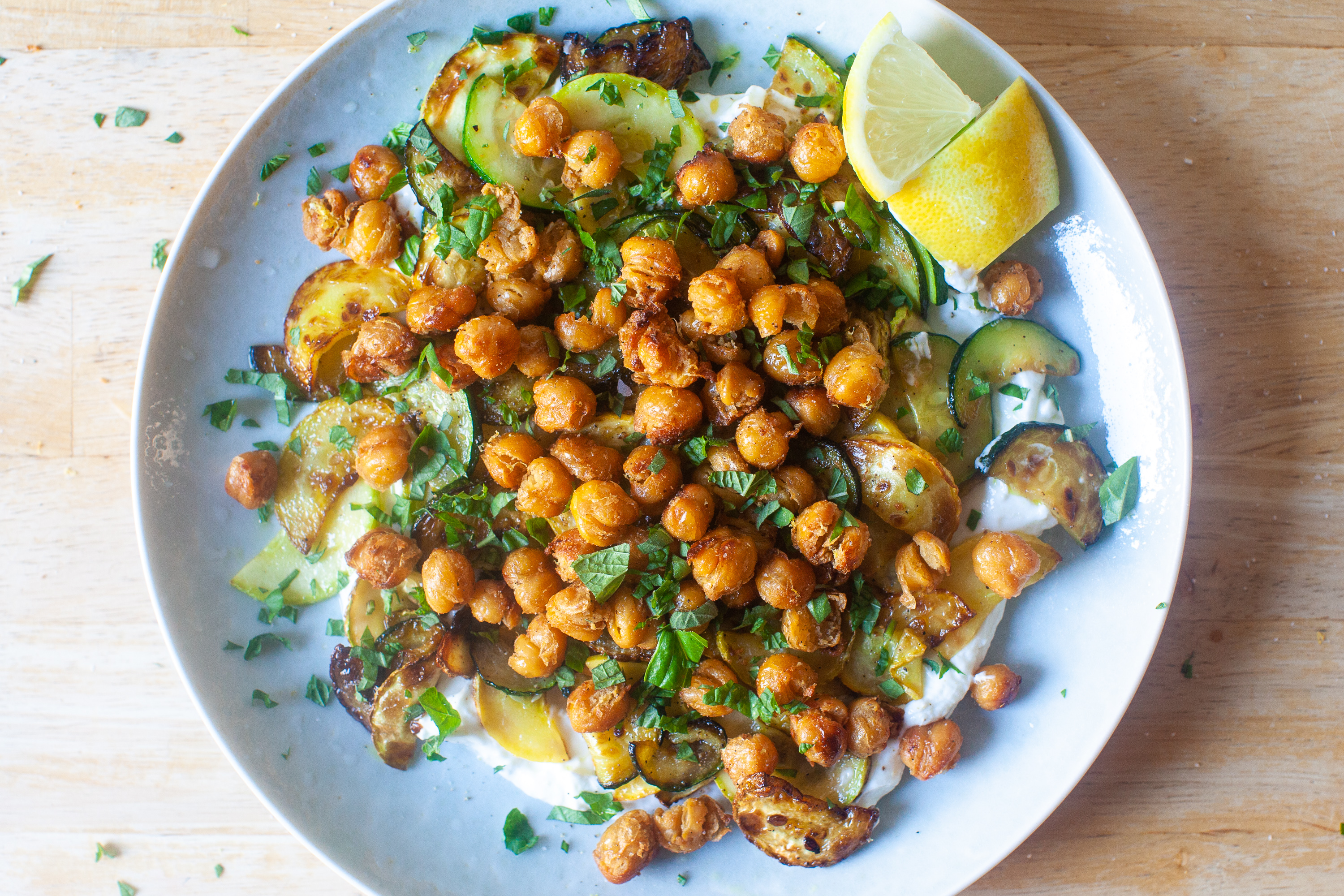 crisped chickpeas with herbs and garlic yogurt